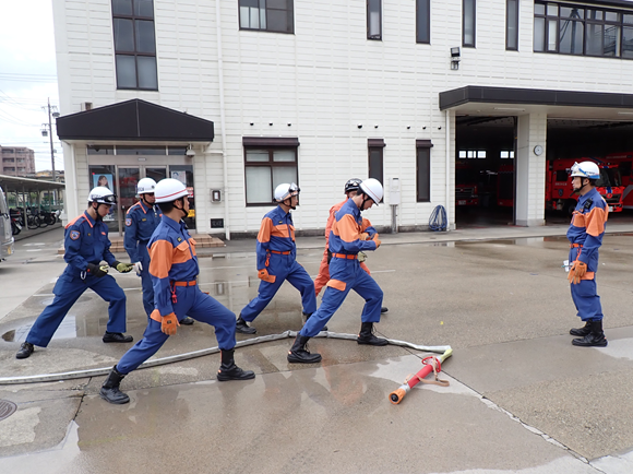 放水訓練では、一人ひとりが正しい姿勢を意識しながらホースを取り扱い、効率的な放水方法を学びました。放水時の補助者も放水隊員を助ける役割を意識して取り組みました。