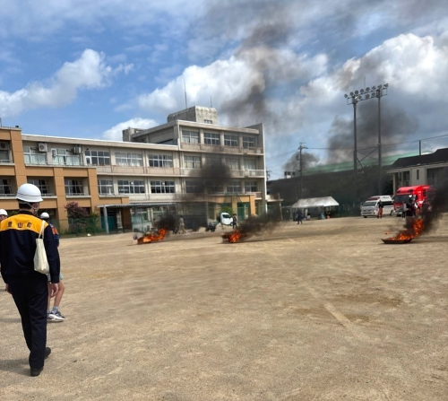 残暑の中、多くの町民の皆様と共に、今年度も総合防災訓練に参加しました。消火器を使用した消火訓練では、本物の火を使用した実戦的な訓練を行い、参加された町民の方からは緊張感が漂っていました。